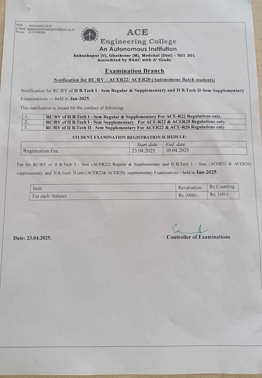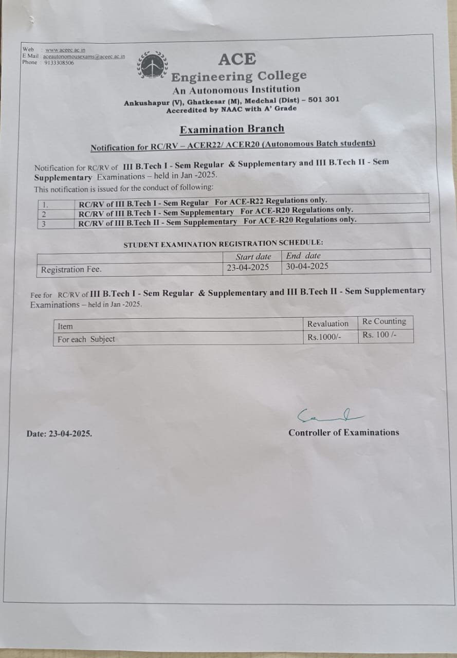 - II & III B.Tech I Sem (ACE R22) Regular & Supplementary, II & III B.Tech I Sem & II Sem (R20, R22) Supplementary, examinations held in Jan 2025, and its results were declared on 23-04-2025